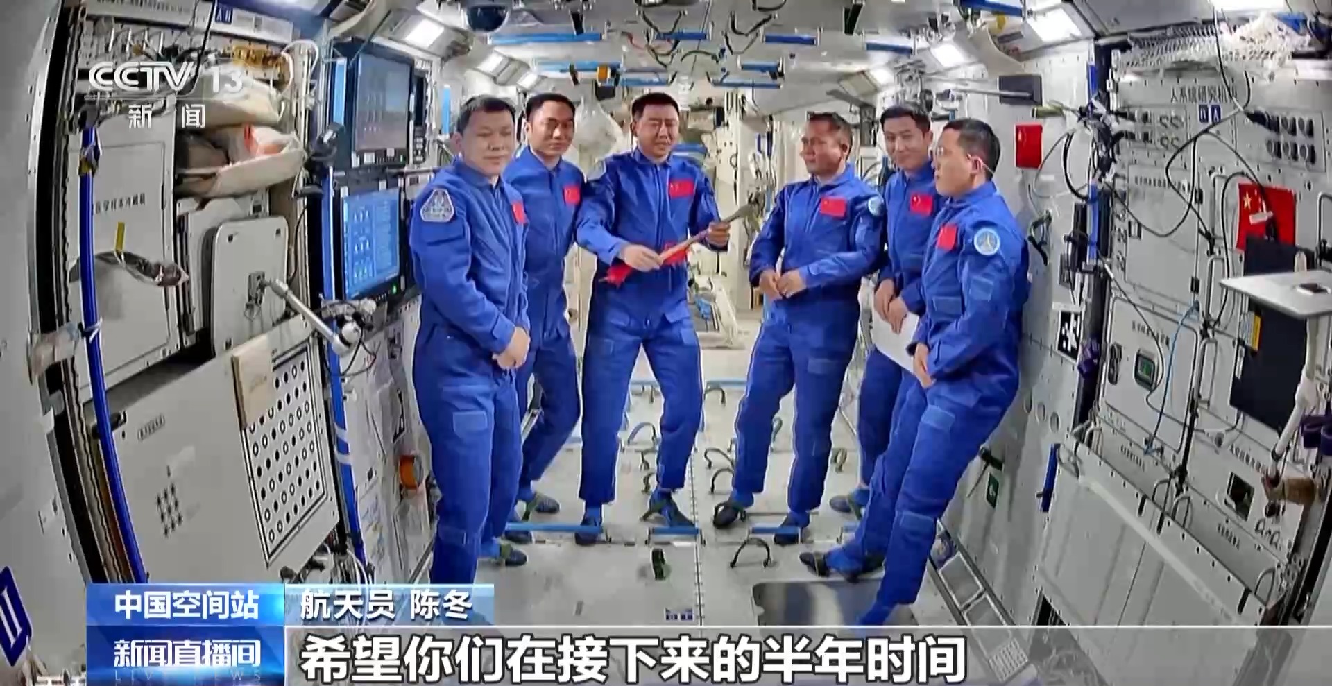 上午11时许,神舟二十号和神舟二十一号航天员乘组在中国空间站天和核心舱进行交接仪式,六名航天员分别在确认单上签字。随后,神舟二十号指令长陈冬将象征空间站的钥匙交给神舟二十一号指令长张陆。